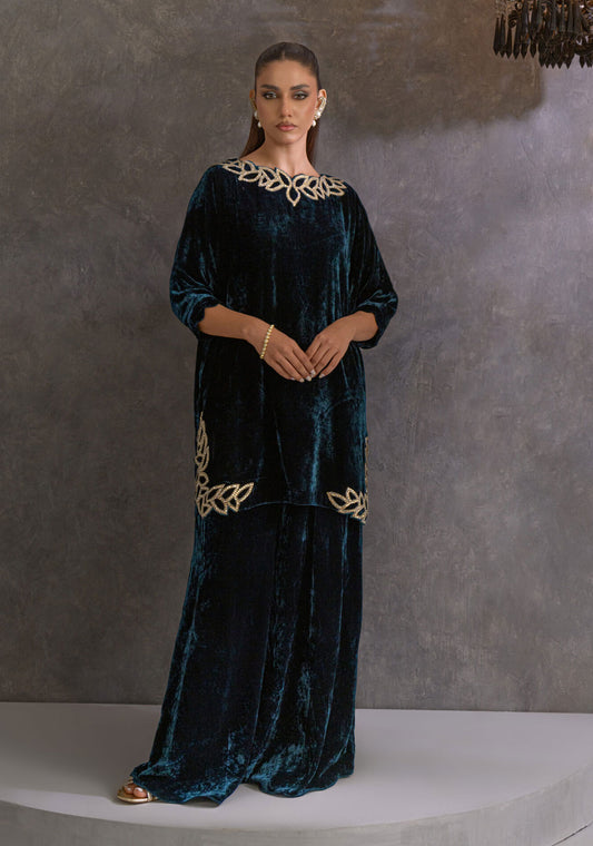 A rich teal velvet co-ord set adorned with champagne-toned crystal leaf embellishments framing the neckline...