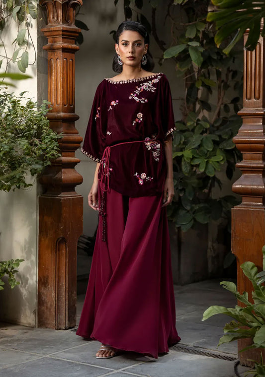 Maroon velvet cape adorned with exquisite thread and handwork details, paired with a matching belt...