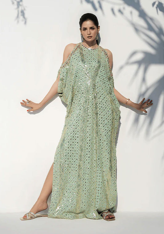This stunning mint green kaftan feature a contemporary cold shoulder design, adorned with champagne and...