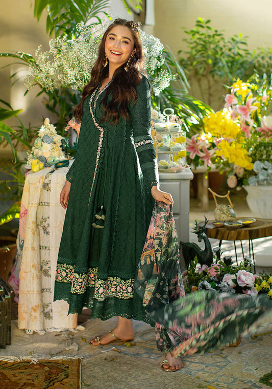 Signature Schiffli Kalidaar of moss green with accents of powder pinks and mints along with...