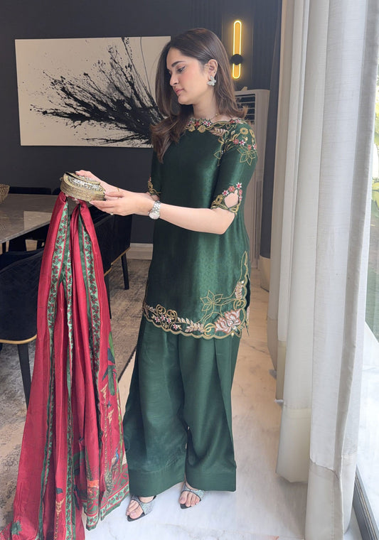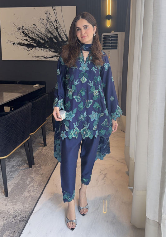 This three-piece ensemble is designed for festive and formal occasions, crafted with pure hand-woven muslin...
