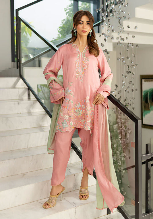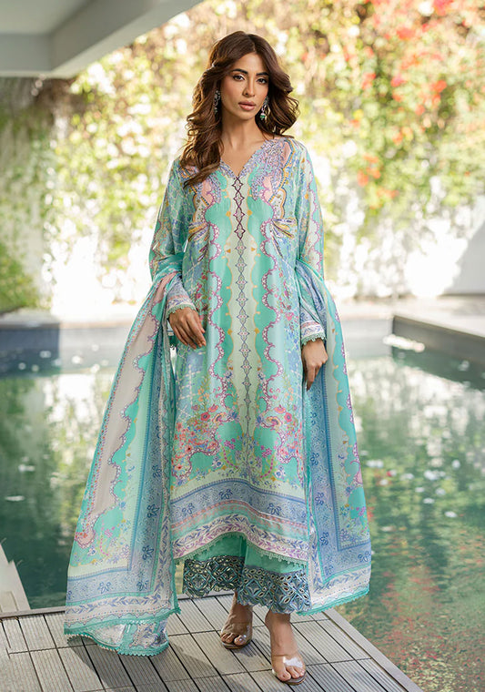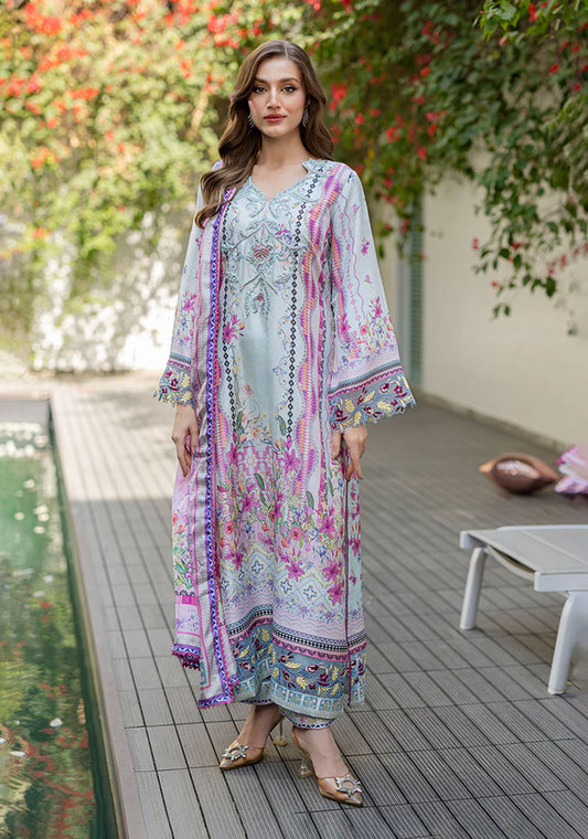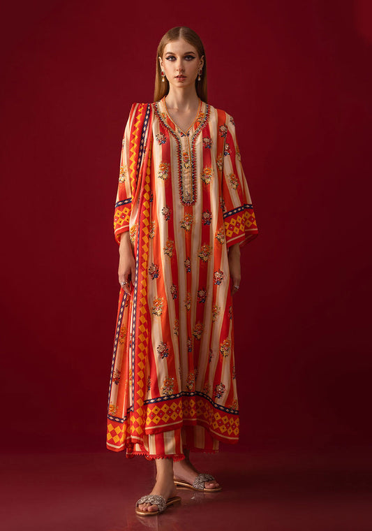 A printed crepe shirt with an embellished neckline is paired with a printed shalwar and...
