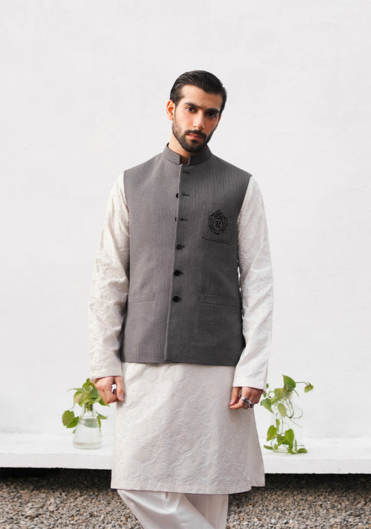 Grey herringbone waistcoat, with embroidery on pocket and front button closures.