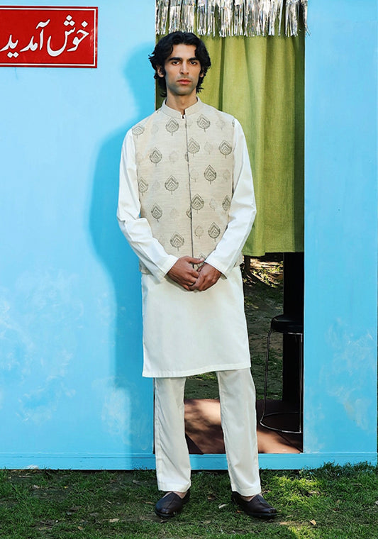 'Beige, self-jamawar bandh gala suit, with embroidered geometric and floral patterns, detailed with sequins and...