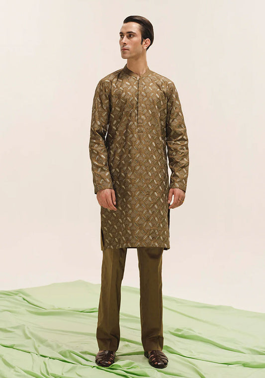 'Olive green self-woven embroidered cotton kurta and pajama set, with geometrical and acanthus-leaves patterns and...