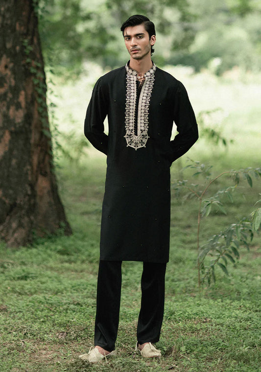 'A black kurta and pajama set with fawn contrast embroidery inspired by roman architecture, on...