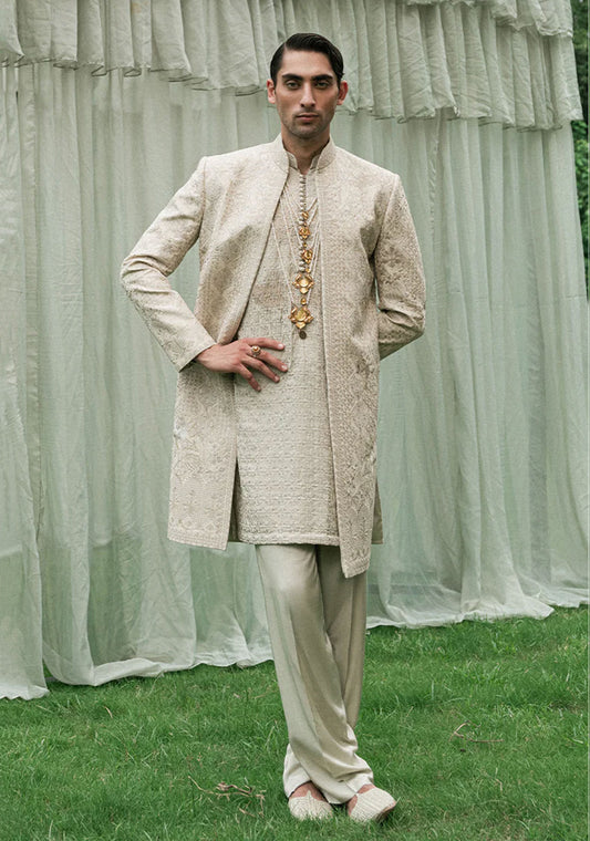 'Taupe toned, handmade jacquard sherwani, with hand embroidered geometric and floral patterns merged with tilla...