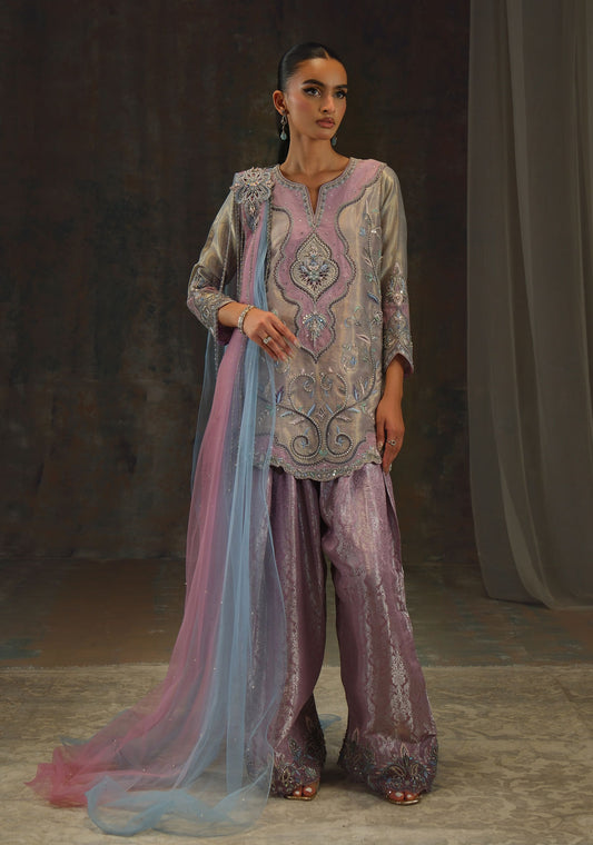 This Ombre silk ensemble captures the quiet magic of starlight meeting daybreak. Hand-embroidered in delicate...