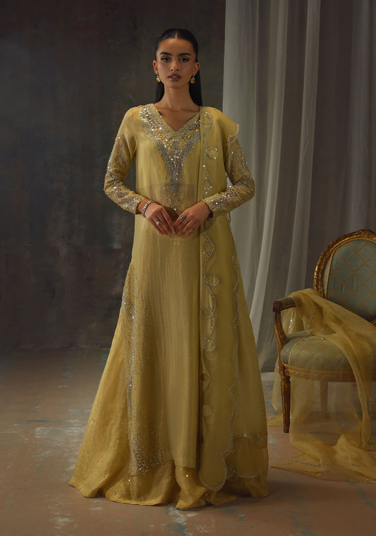 Bathed in a soft golden hue, and crafted from luminous zari net, the fluid silhouette...