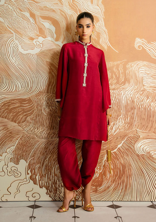 A striking red kurti in Korean raw silk with matching trousers, adorned with the delicate...