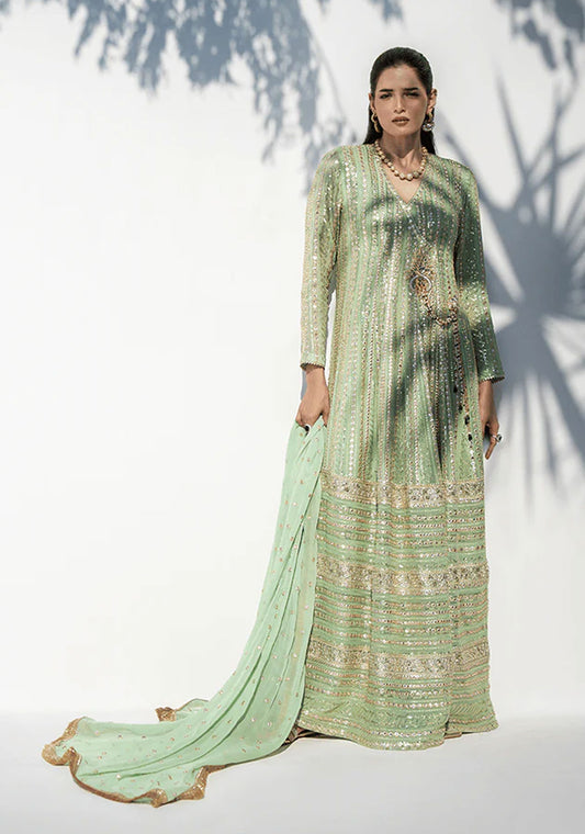 This elegant ensemble features a mint green angarkha crafted from mirrored fabric that lends a...
