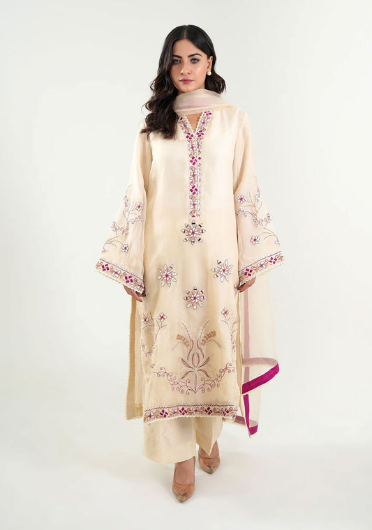 Beige traditional outfit featuring intricate embroidery and a matching staller. The kurta is designed with...