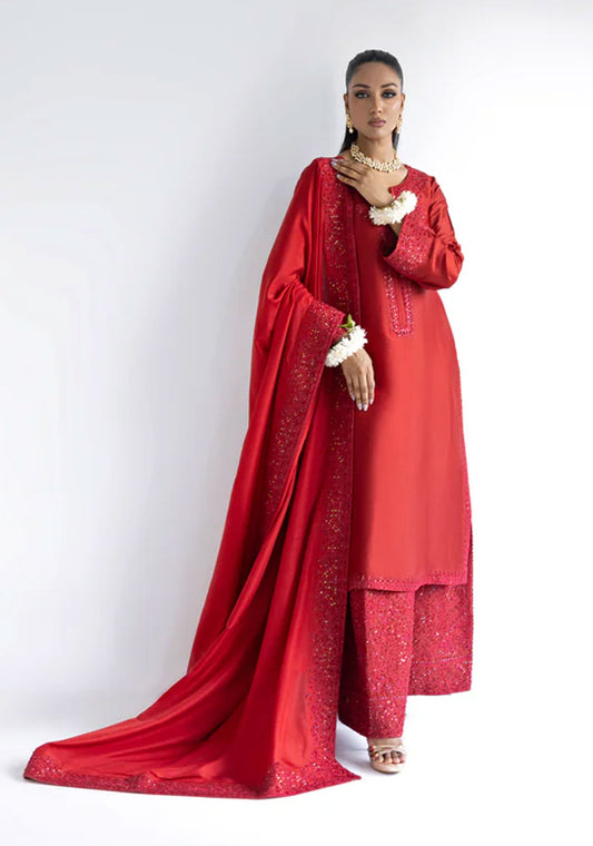 Fire red, double-layered (raw silk underlayer, organza overshirt) with embroidery, lace, and gold contrasts. Undershirt has churidar sleeves, overshirt...
