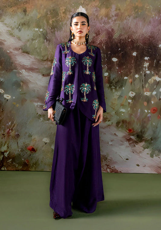 Radiating elegance, this deep purple luxury formal is adorned with exquisite multi-colored handcrafted motifs that...