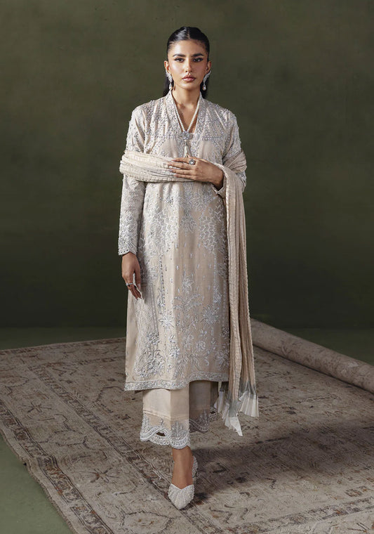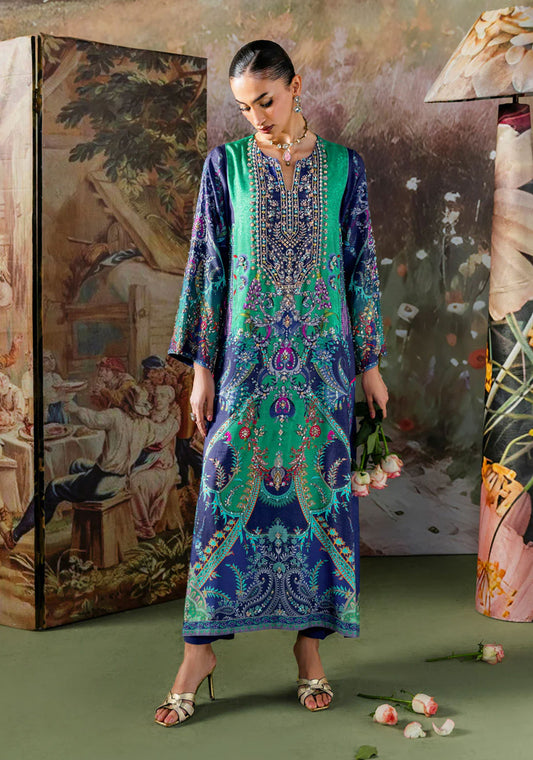 An opulent ensemble crafted from richly embroidered fabric, featuring a beautifully hand-embellished neckline with accents...