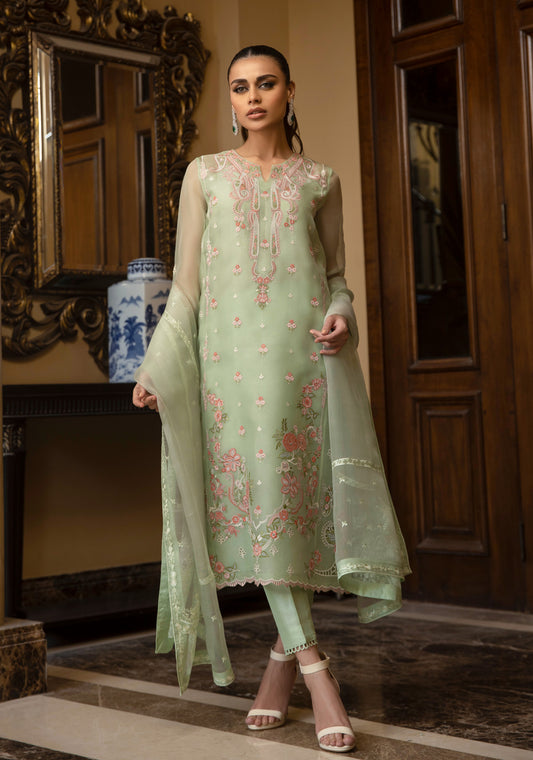'A sage green, organza shirt enhanced with embroidery on the front and sleeves; made complete...