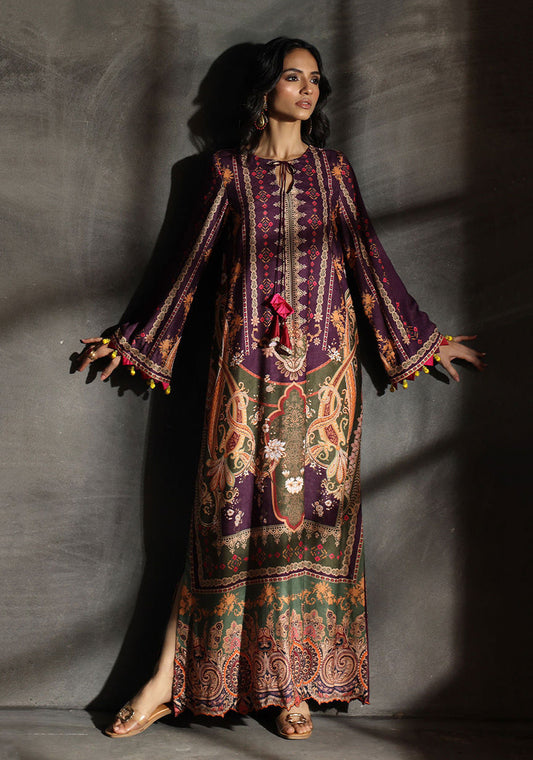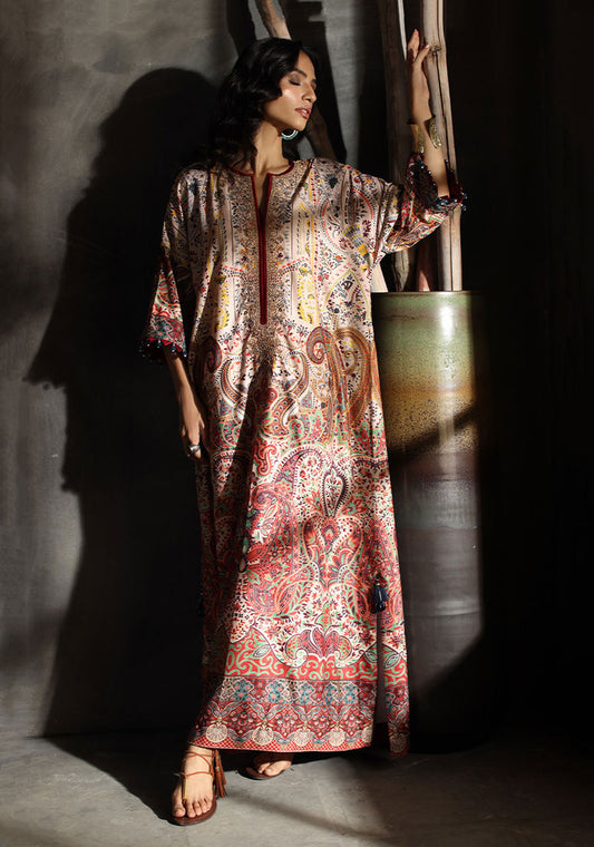 A velvet kaftan that celebrates color and craftsmanship, featuring vivid multicolor prints with subtle embroidery...