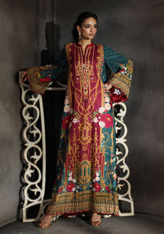 ‘Ruby Radiance’ embodies regal elegance featuring a long, velvet kameez adorned with intricate gold embroidery,...