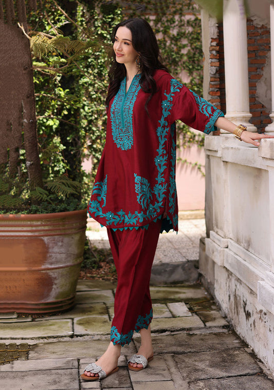 Eliz features a stunning maroon and turquoise short shirt with intricate embroidery, blending classic elegance...