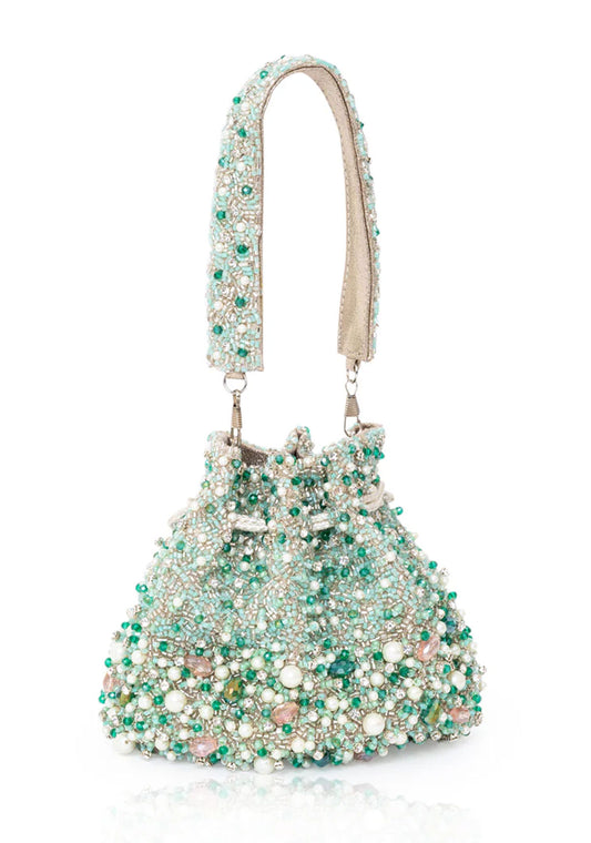 Our Fareeda Bucket Potli is decadently hand embroidered with an assortment of raw gemstones, glass...