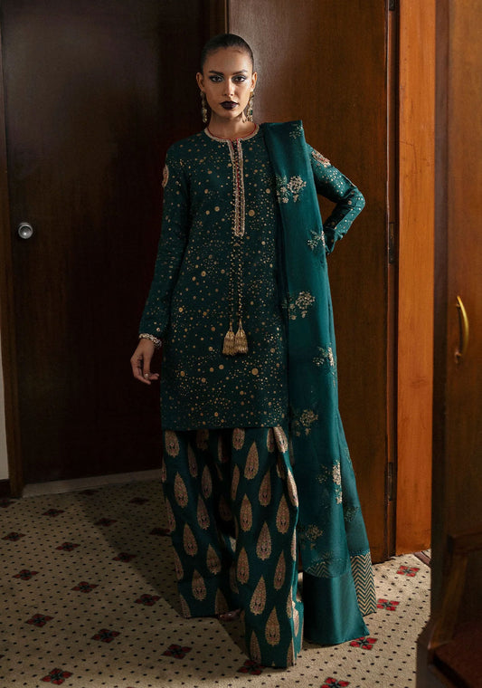 Pure butter silk tailored into a flowing jacket and boxed pants, adorned with intricate embroidery...