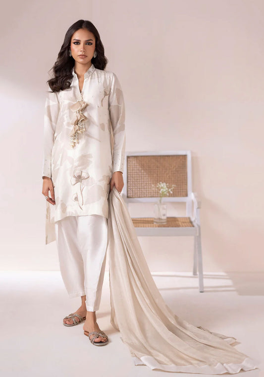 An ivory sheer-sleeved top with embellishments. The lower part of the outfit features full-length ivory...