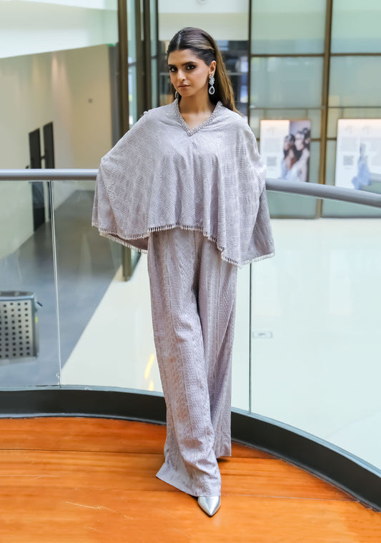 A two-piece ensemble featuring a light-colored, lilac, cape-style top and matching wide-leg pants. The top...