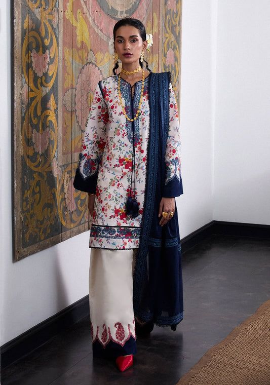 Make a statement this summer with our ivory printed lawn outfit, beautifully accented with navy...