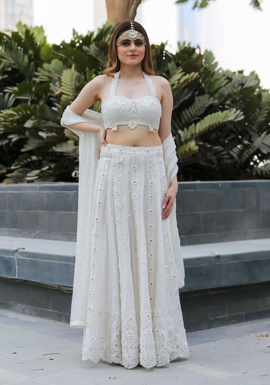 Embroidery: Lace applique with diamante and sequins Fabric: Irish Linen Item: Top, Skirt, Dupatta