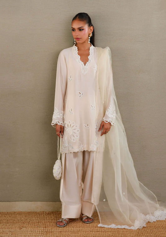 Mehr, in a serene off-white ivory hue, mirrors the stillness of morning light touched by...