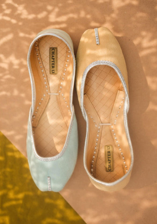 Upper Micro velvet fabric upperShiny Silver faux leather edgingSilver tilla thread stitching on tip and...