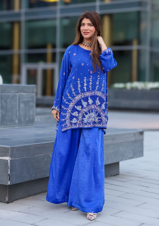 Make a bold yet refined statement with this cobalt blue embroidered co-ord set. The relaxed-fit...