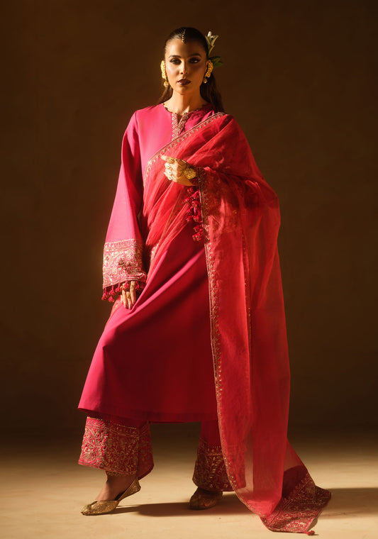A luminous shirt adorned with sequin embroidery, paired with a delicately embroidered organza dupatta and...