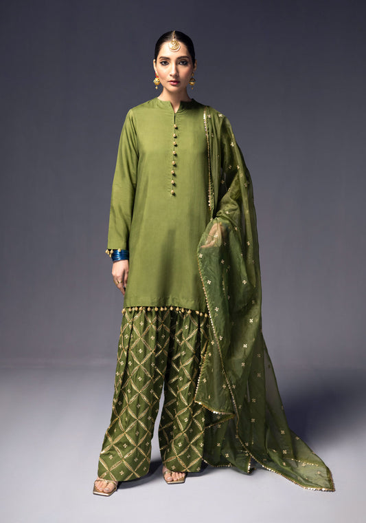 An elegant olive green silk set featuring an embroidered shalwar adorned with intricate golden patterns....