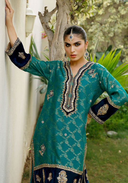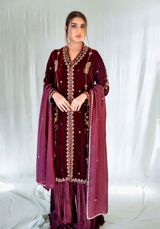 ‘Ruby Radiance’ embodies regal elegance featuring a long, velvet kameez adorned with intricate gold embroidery,...