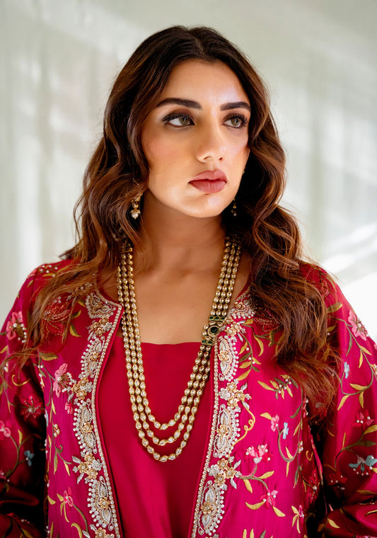 Elevate your style with this stunning ensemble featuring a vibrant magenta pure sheesha silk jacket,...