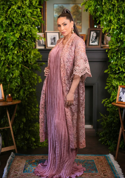 Elevate your style with our Powder Pink Jacket Ensemble. The fully embroidered front-open jacket, crafted...