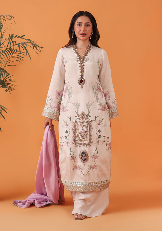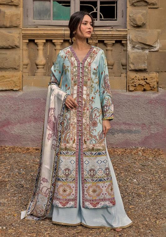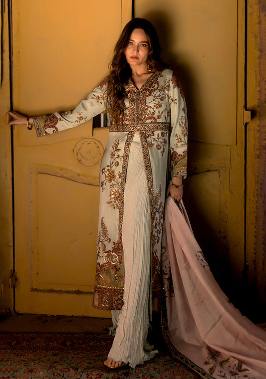 This luxury pret ensemble features an intricate, all-over floral pattern that evokes the aesthetic of...
