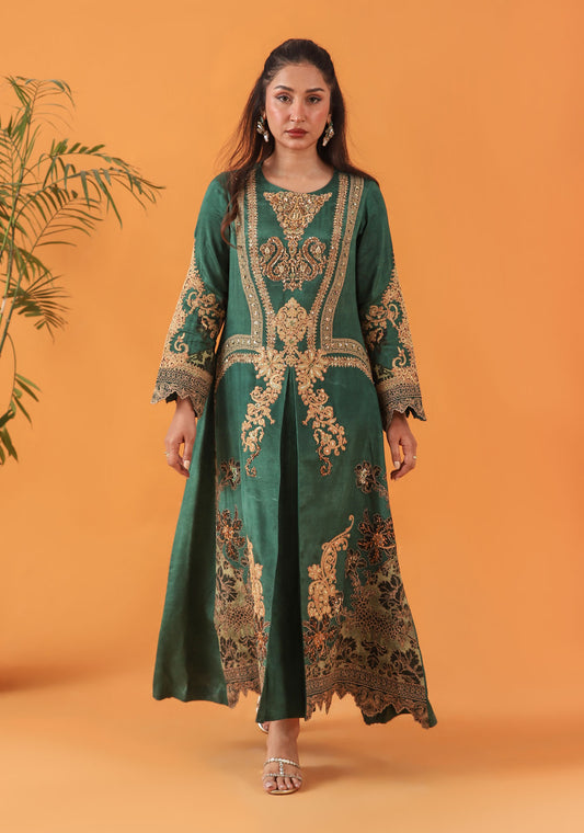 A regal emerald jacket adorned with plush velvet appliqués, intricate gold detailing, and signature Shamaeel...