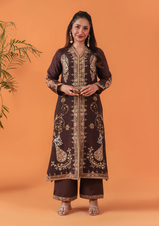 A regal front-open long coat crafted in luxurious silk, adorned with intricate, heritage-inspired motifs that...