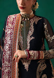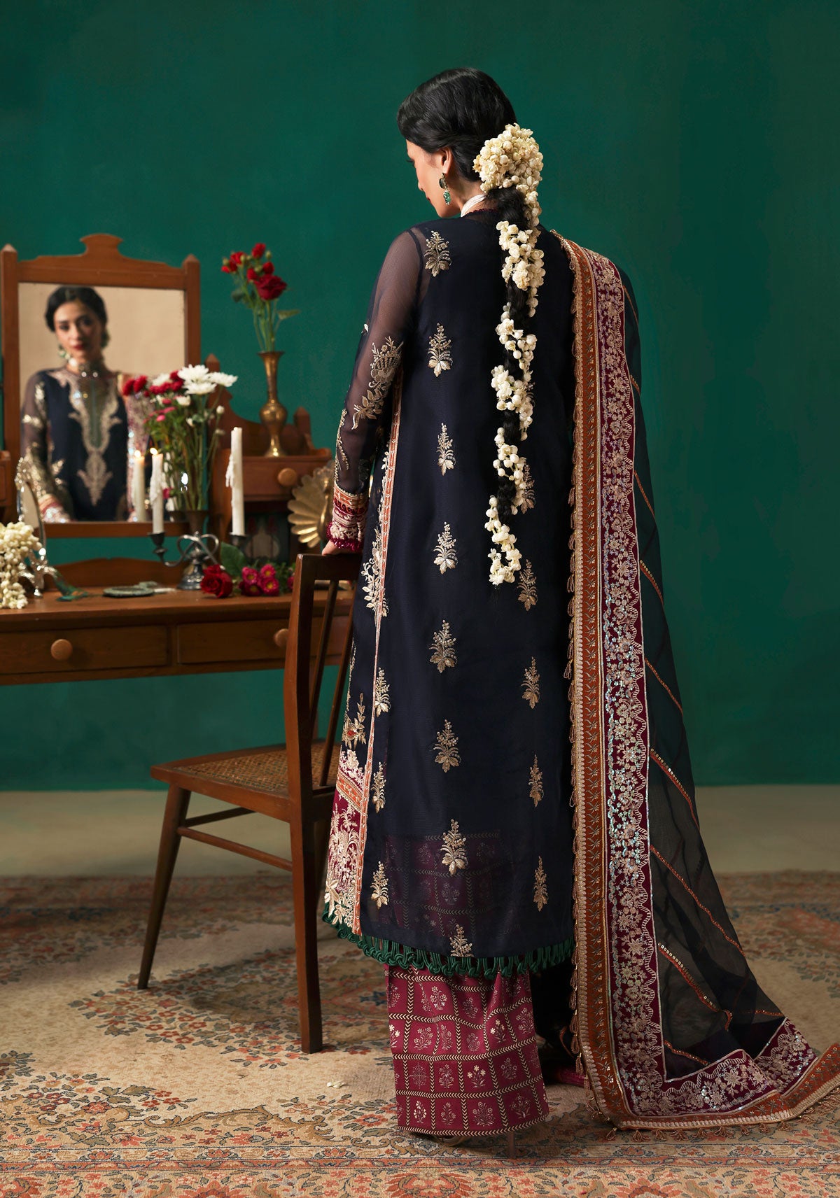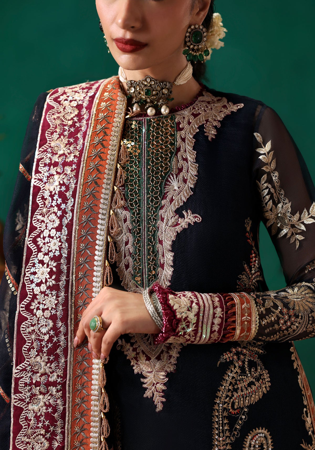 A regal navy blue creation combining embroidered net and silk, detailed with luxurious borders, embellished necklines, and an intricately embroidered dupatta. The printed crepe silk trouser and smooth silk inner complete the look, making it perfect for weddings, festive events, or elegant evening occasions.