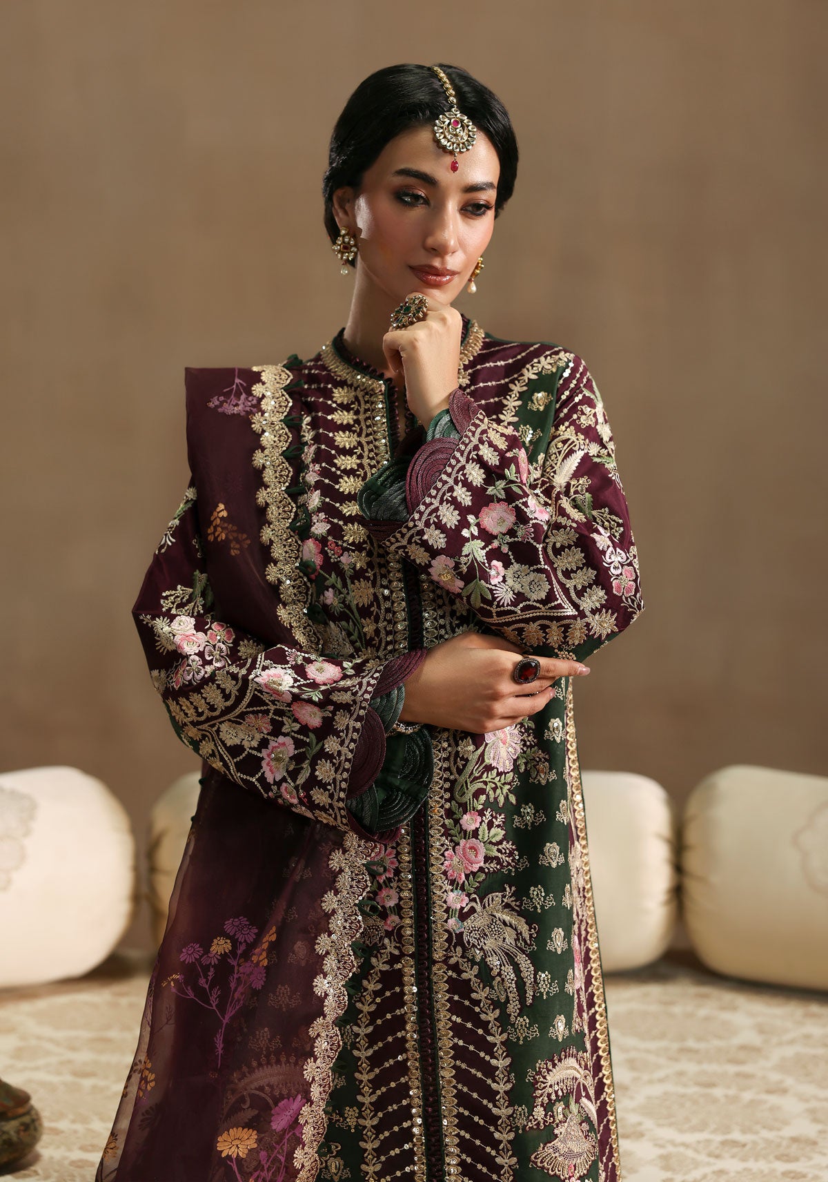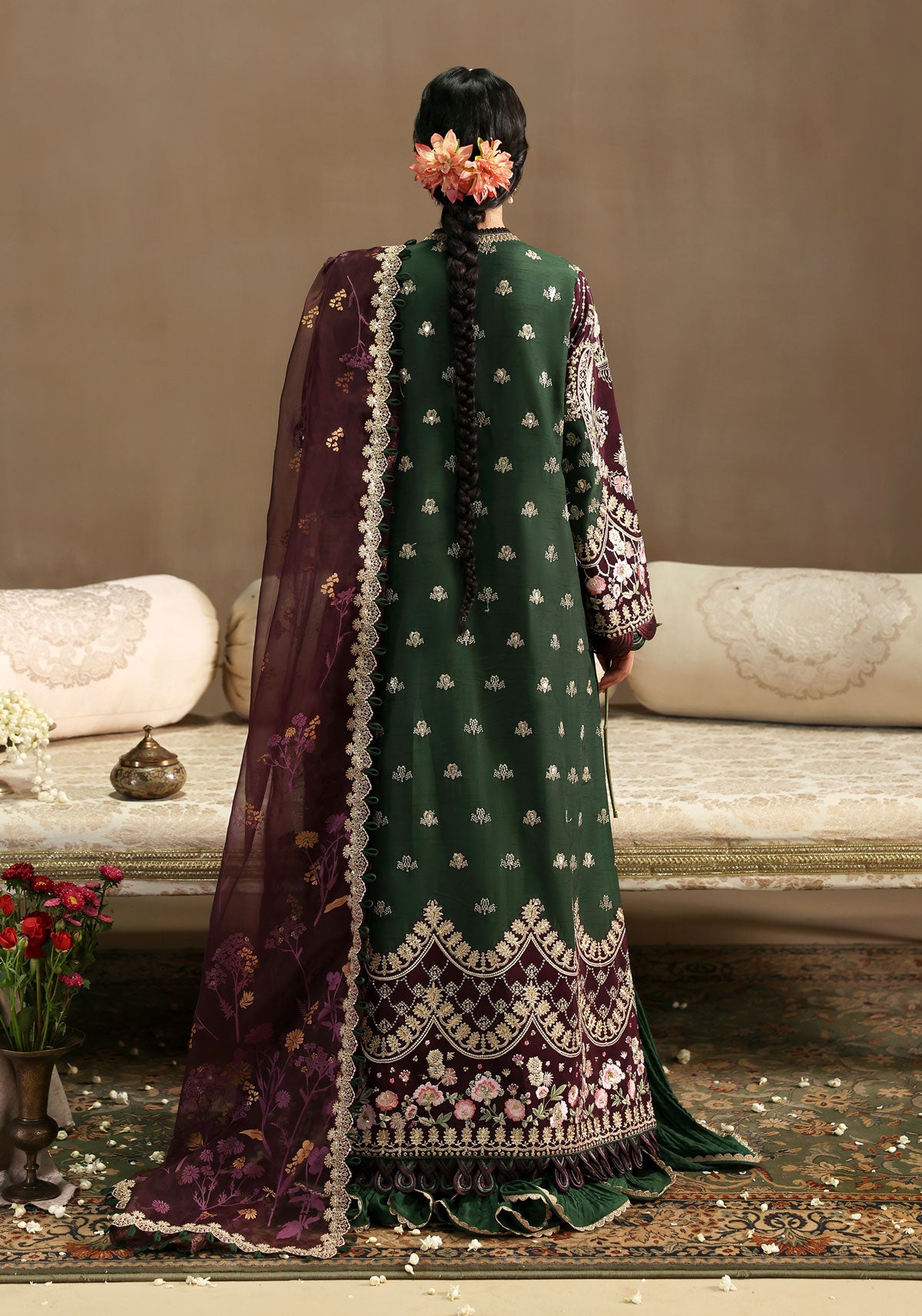 Paired with a digitally screen-printed organza dupatta framed with an 8-meter embroidered border, this ensemble brings a balance of traditional charm and contemporary sophistication.