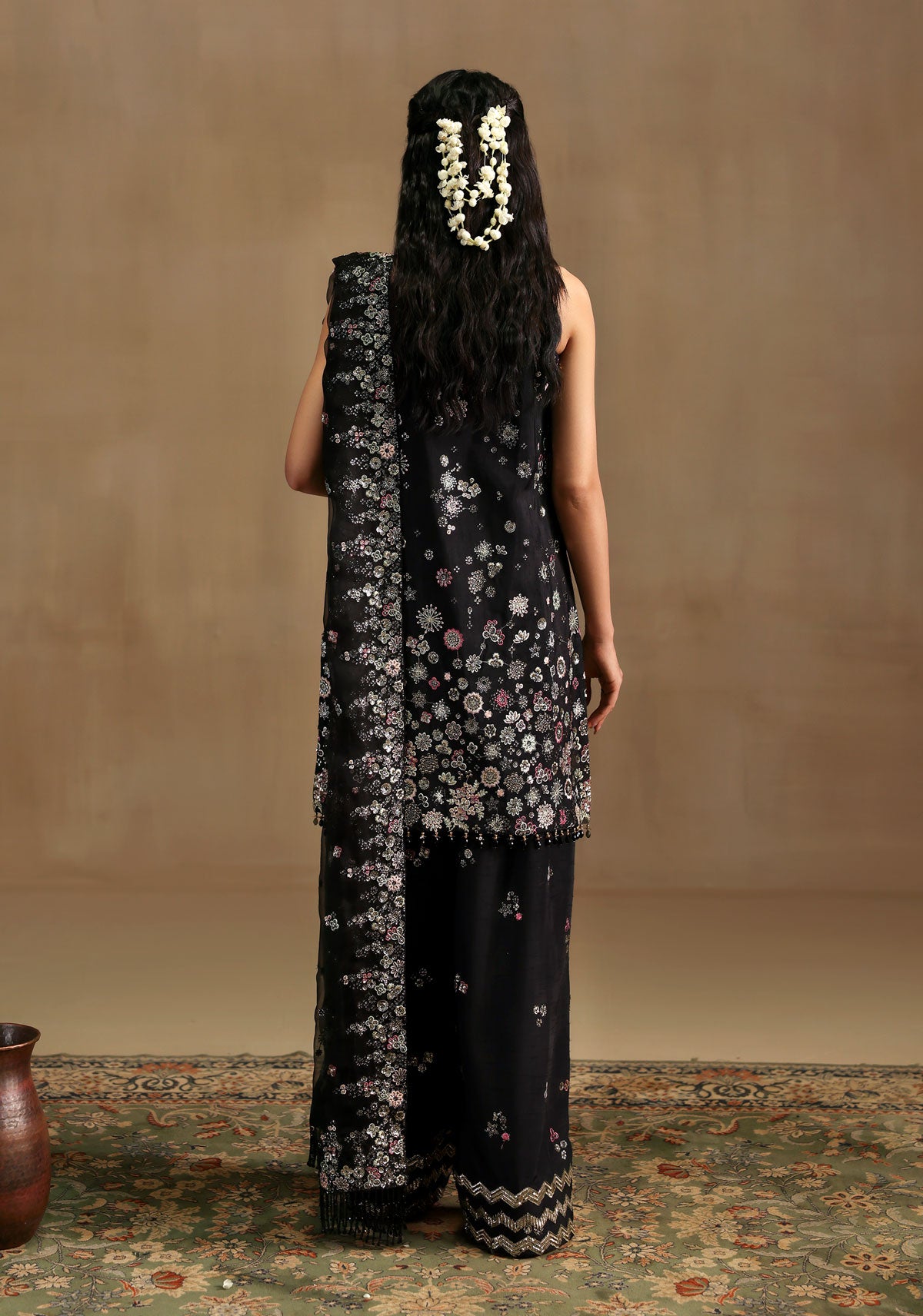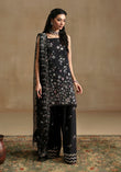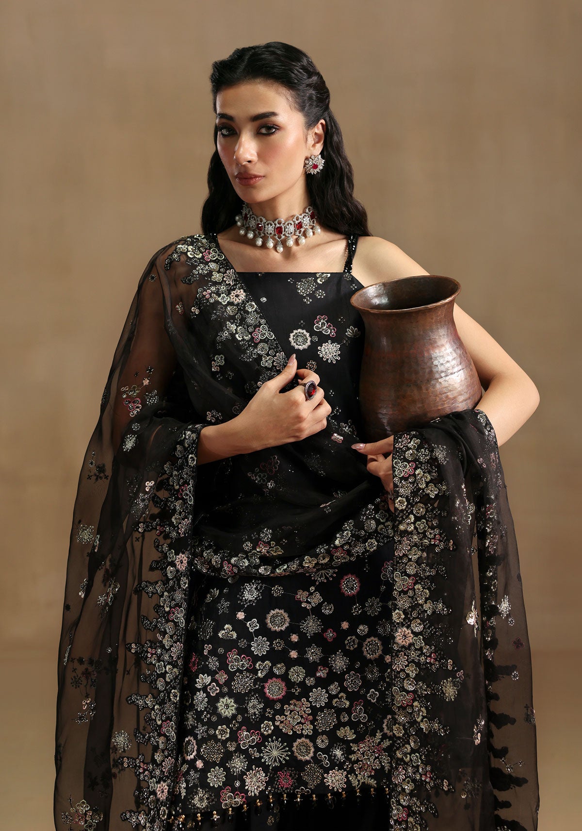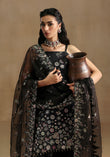 An exquisite embroidered ensemble crafted from luxurious raw silk, adorned with intricate thread-work and paired with a delicately detailed organza dupatta. The design blends timeless craftsmanship with refined modernity, perfect for festive and formal occasions.