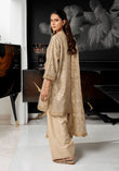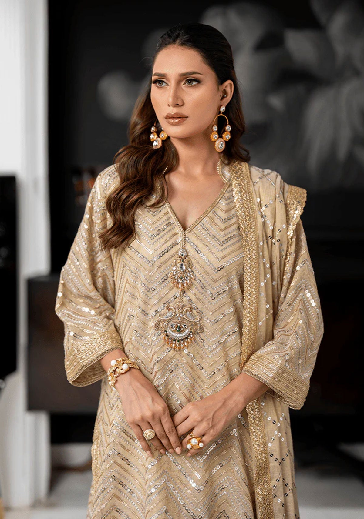 Gold zig zag sequined tunic featuring hand embellished lachas on the neckline, paired with a traditional farshi shalwar. The look is completed with a dupatta edged on all four sides with embellished lace for a regal finish.