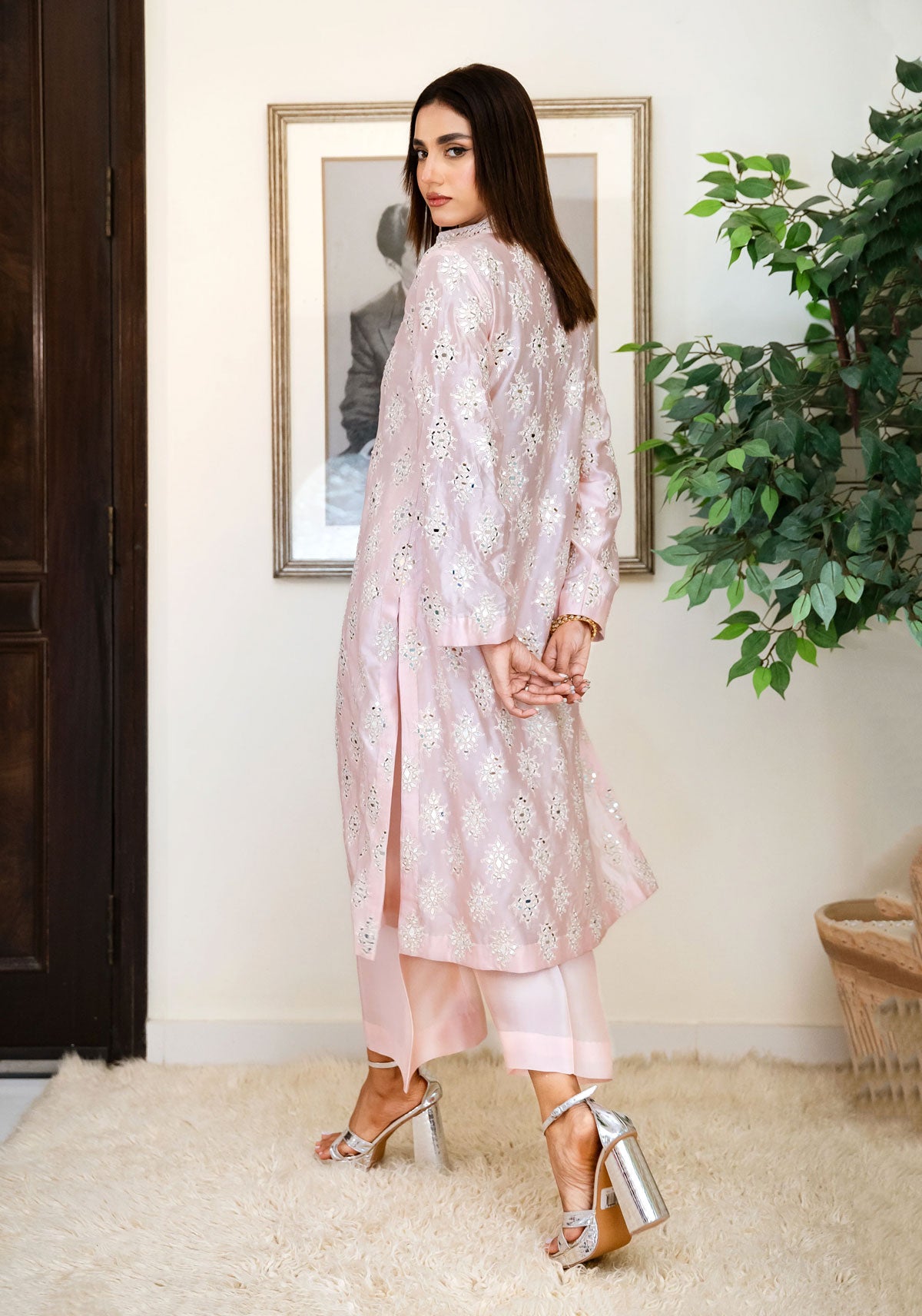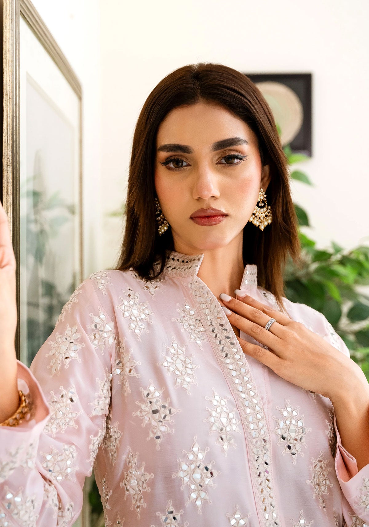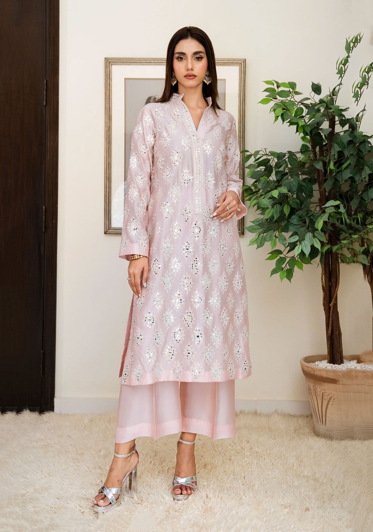 Make a dazzling statement with the 'AAINA' kurti, featuring intricate mirror work on rich sheesha silk. Paired with matching sheesha silk pants, this glamorous duo is a true showstopper for weddings, parties, or any formal occasion.