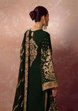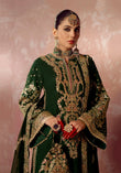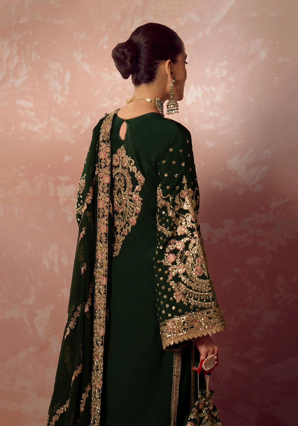 Discover the artistry of Jade. On a canvas of teal green pure shesha silk, skilled hands have created a masterpiece with Swarovski crystals, dabka, cutdana, and sequins. Velvet appliqué and intricate resham and sequin embroidery details elevate this ensemble. Paired with a pure silk dupatta and Korean raw silk trousers for a truly refined look.