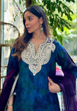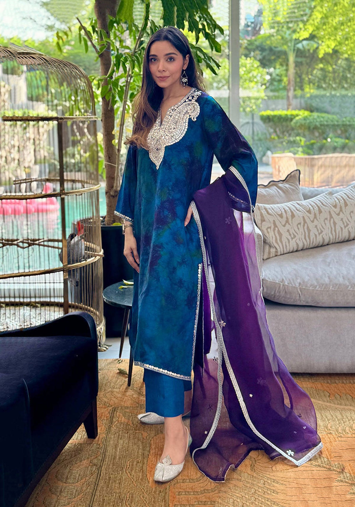 A vibrant electric blue tie-dye silk kurta, adorned with delicate hand-embroidered mirror work. Effortless yet striking, it blends breezy comfort with classic elegance. Paired with matching silk pants, it can be styled with a sheer organza dupatta embellished with gota flowers for a festive touch, or a plain medium silk dupatta for timeless sophistication.