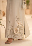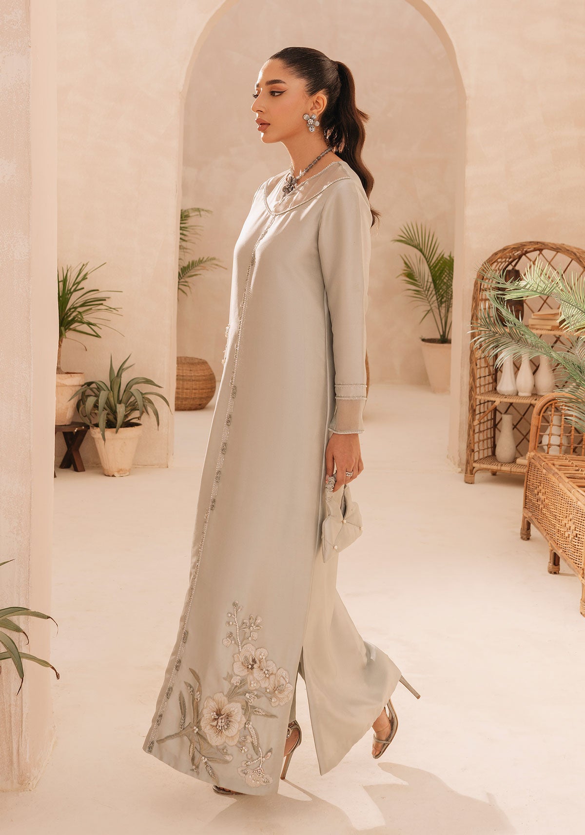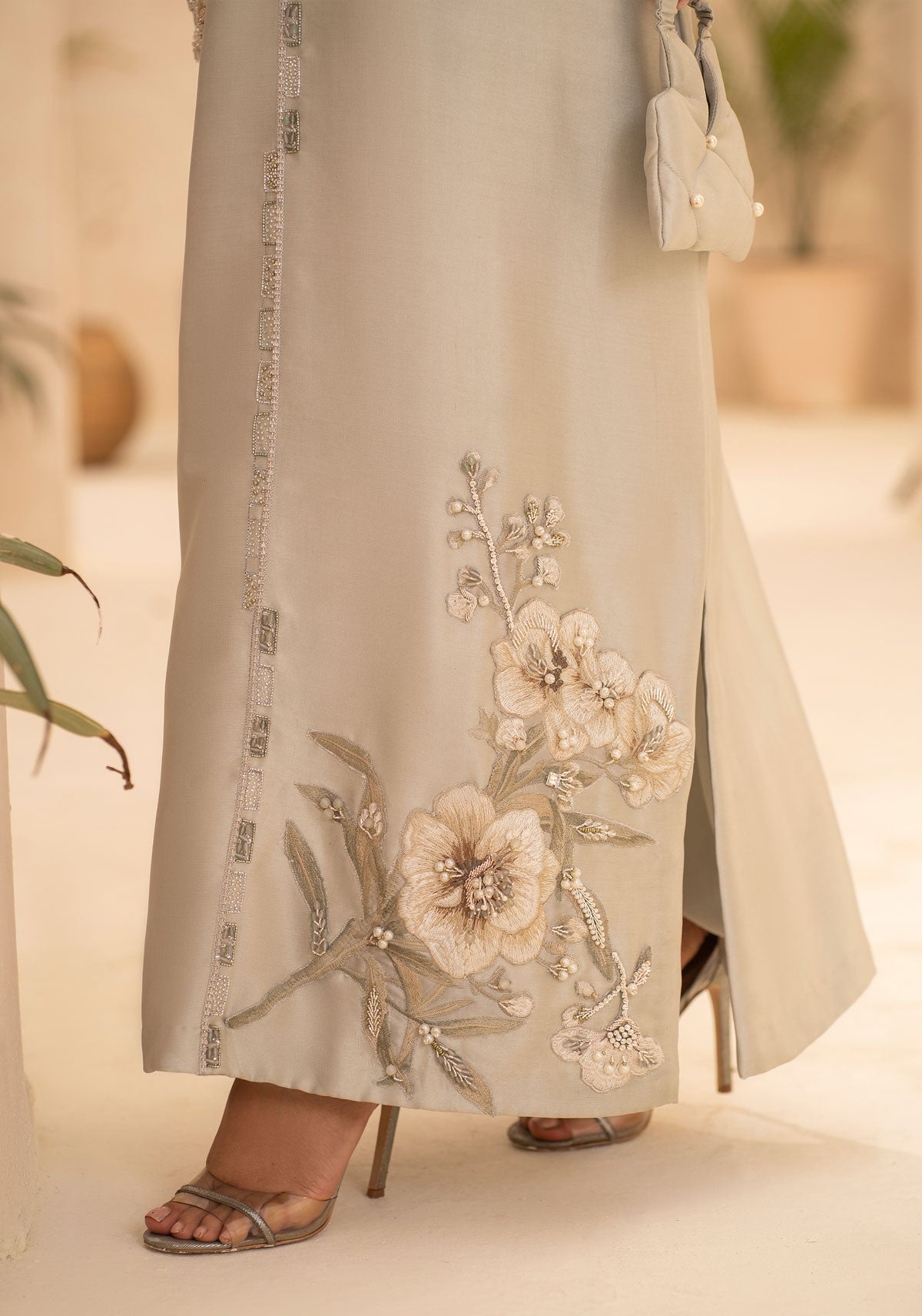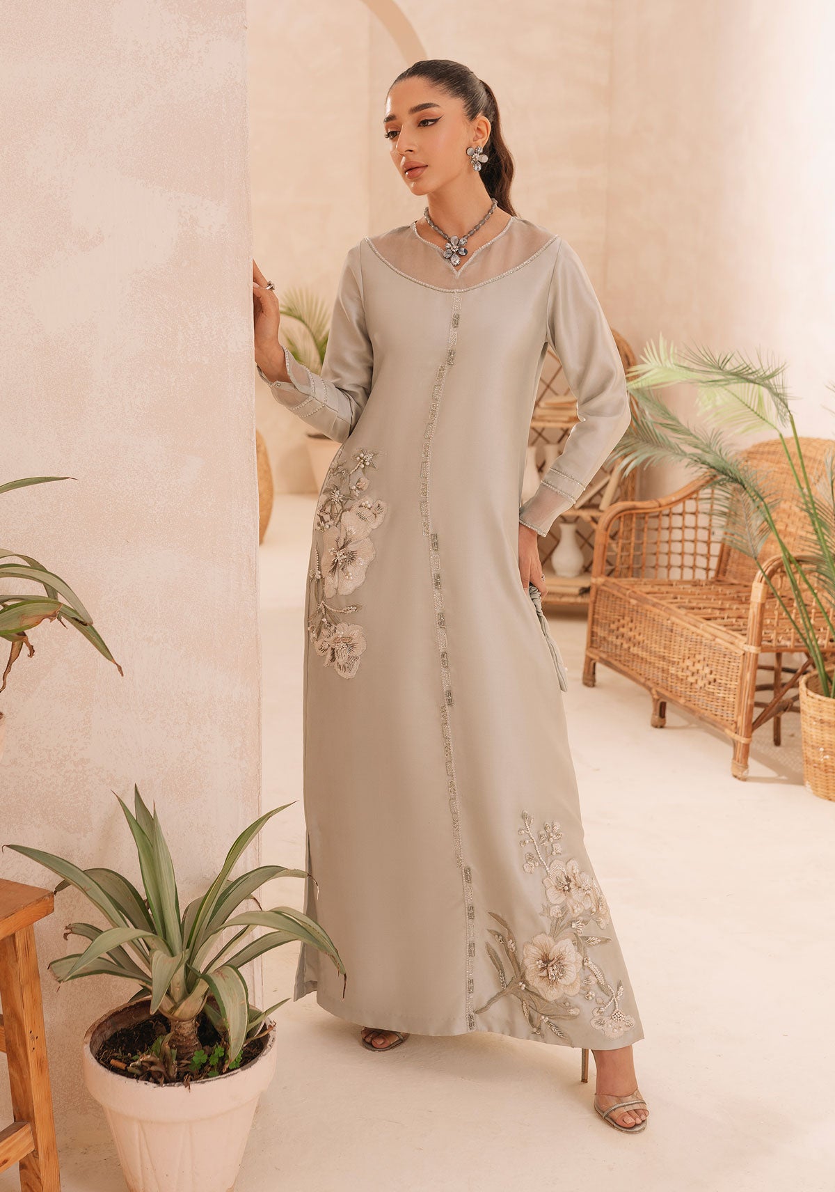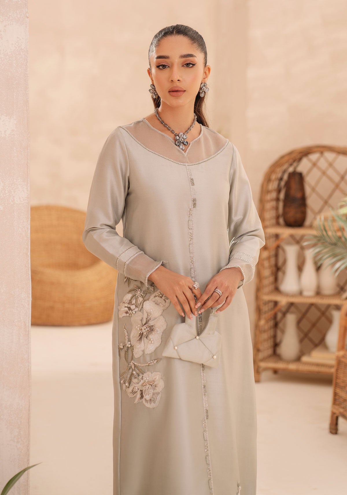 A moss green raw silk shirt with organza patching and embellishment detail on the neck and sleeves and beautifully embroidered and embellishments motives on the front of the shirt paired with a silk trouser.