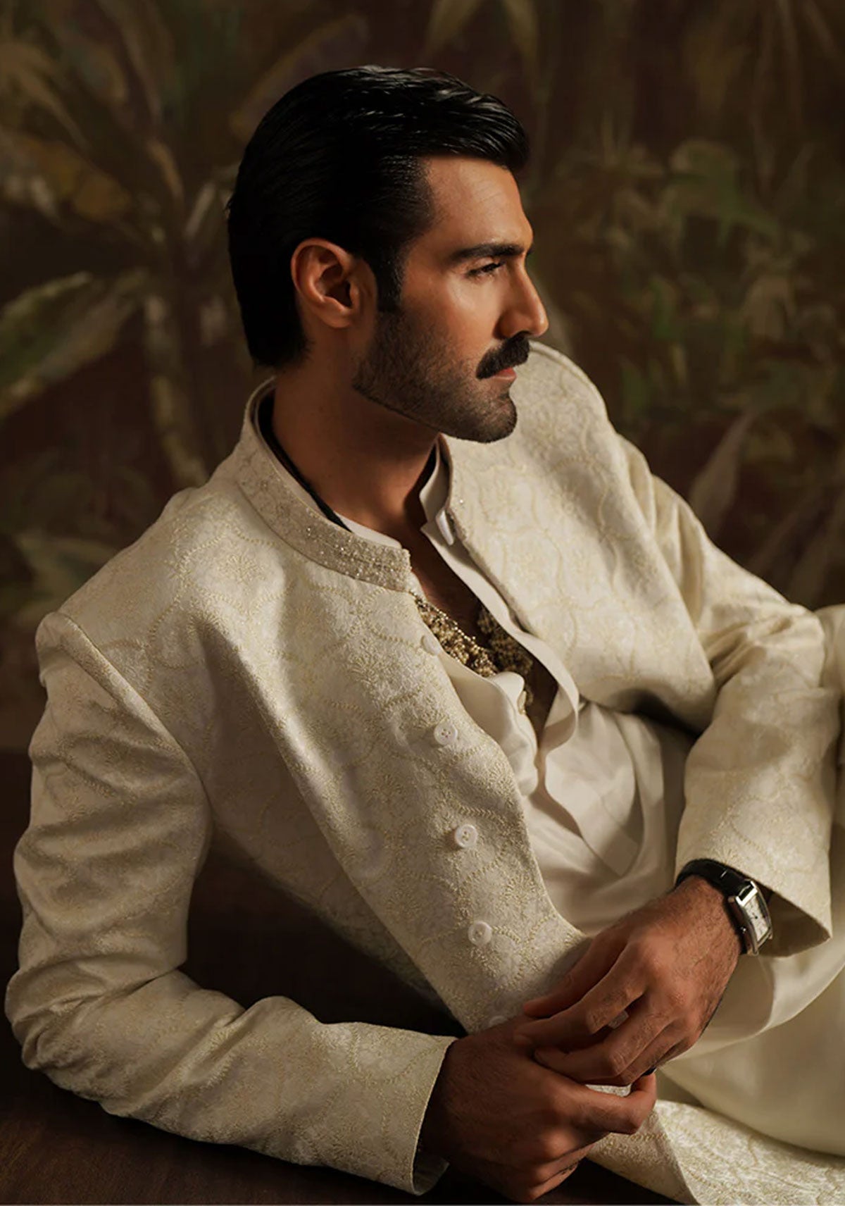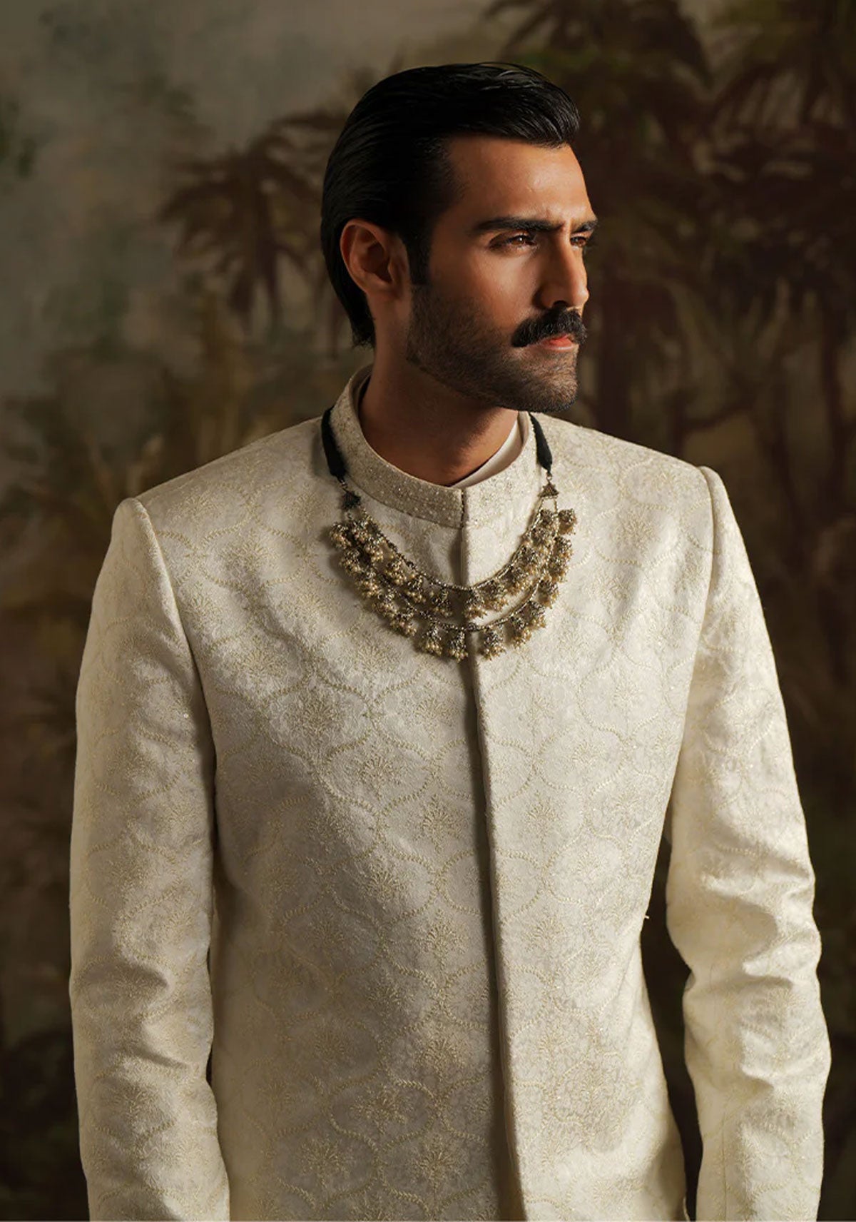 Ivory white jacquard embroidered sherwani, with floral embroidered patterns, detailed with sequins and adda embroidery on the box cut band collar.