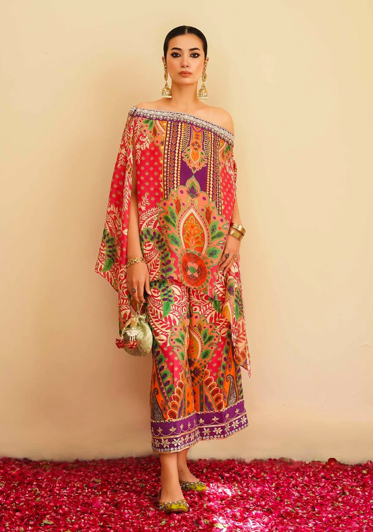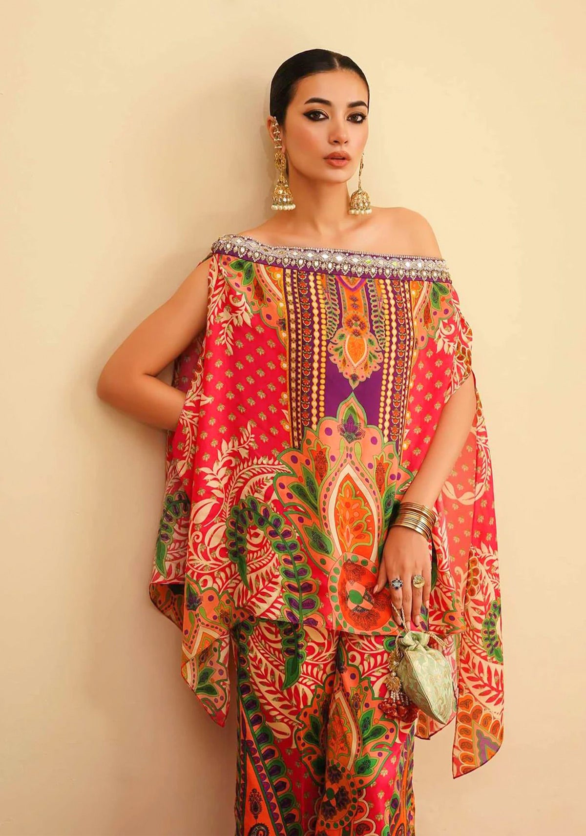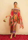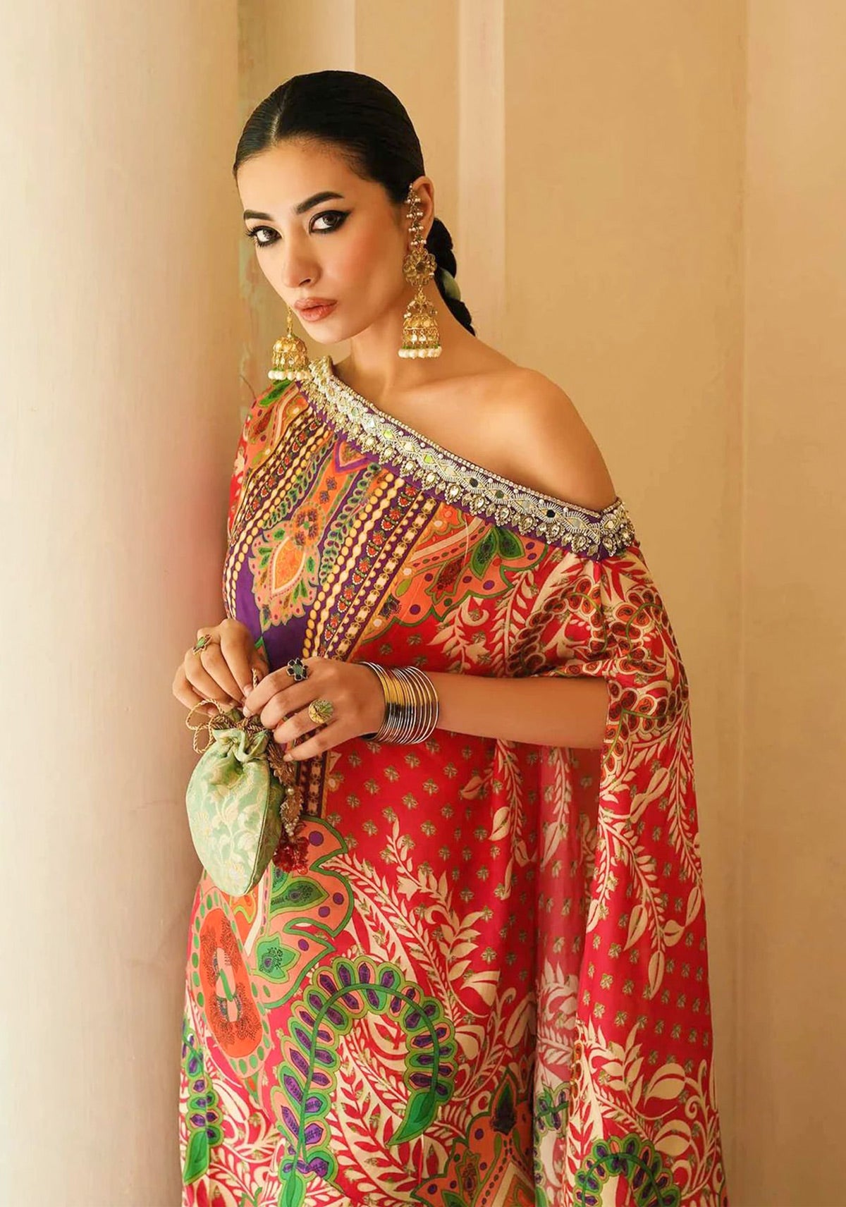 Floral printed Off-Shoulder assymetrical Top with beautiful embellishment in the neckline. Comes with Bustier Inner and printed Cropped Pants Care - Dry Clean Only |